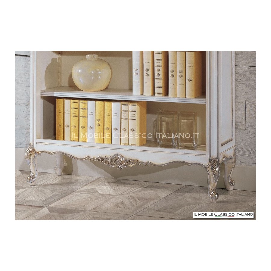 Cette bibliothèque provençale se compose de 4 compartiments ouverts. Les hanches sont fermées. La structure est entièrement en bois massif et présente des sculptures sur les pieds et les profils qui, dans la couleur comme sur la photo, ont été rehaussées par la feuille d'argent. Le meuble bibliothèque de style 700 est capable de combiner parfaitement élégance et fonctionnalité dans une seule solution, le bon complément pour donner un aspect luxueux à votre maison.