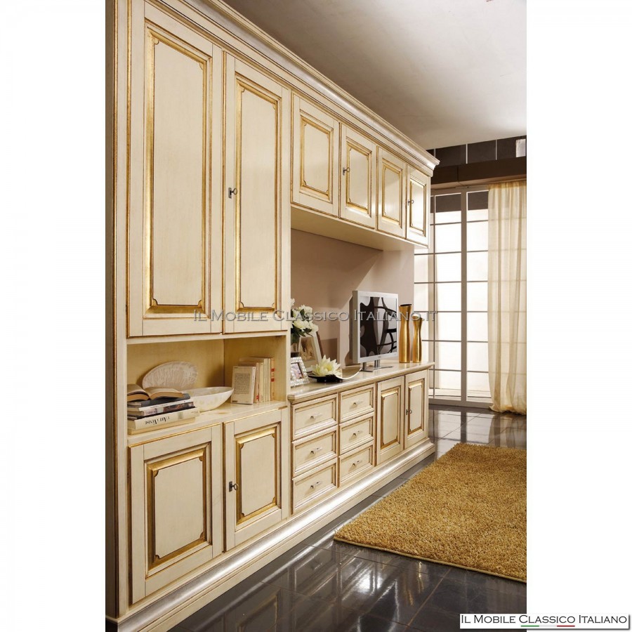 Meuble TV mural classique en composition, en version lisse, composé d'une commode, de compartiments de différentes tailles et d'un compartiment. Les compartiments du meuble TV mural classique sont tous dotés d'une porte en pierre de taille fermée et les tiroirs sont encadrés par un cadre placé sur le bord. Sur la photo, il est présenté dans une version laquée.