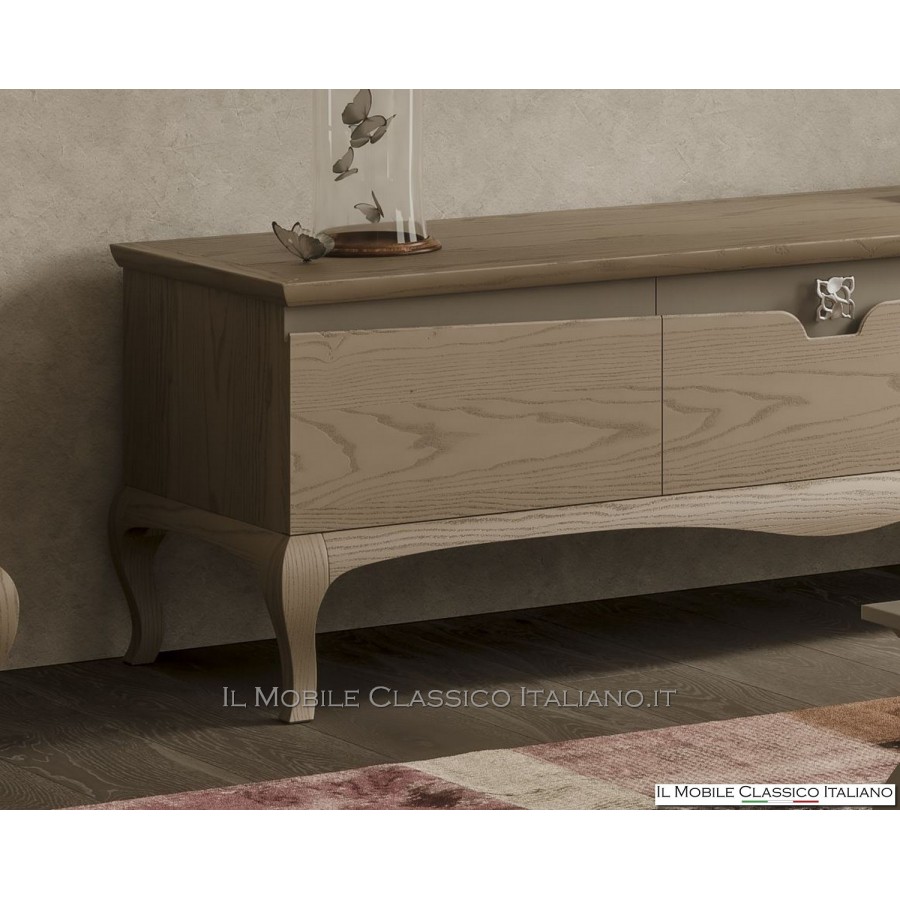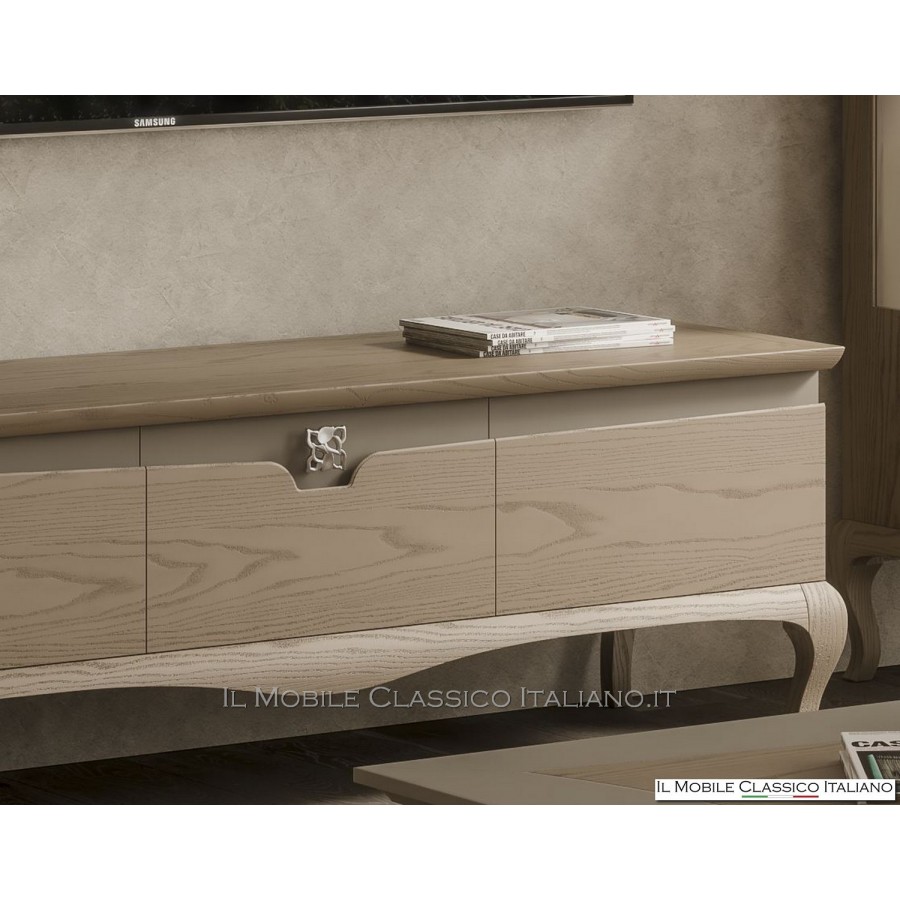 Une sélection de meubles TV fait partie de cette collection, fournie en combinaison avec différents modèles d'unités murales, vitrines et vitrines, tables, tables basses, chaises rembourrées et tous les accessoires pour la chambre tels que commode, tables de chevet, armoires à portes coulissantes et lits en bois et lits rembourrés.