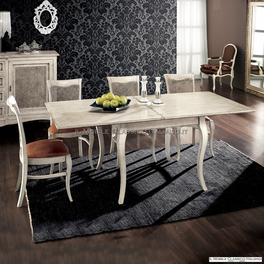 La table à manger pliante , jouant avec les différentes finitions, est une solution polyvalente pour les situations : elle trouve sa place dans les maisons modernes et classiques ou shabby chic. Avec ses pieds en sabre, la table s'adapte à tous les styles de mobilier. . Pour le style classique, nous recommandons une finition dans des tons chauds, noyer ou similaire, tandis que pour le style moderne, une finition laquée et pour le style shabby chic, en revanche, il se caractérise par une finition vieillie et romantique.