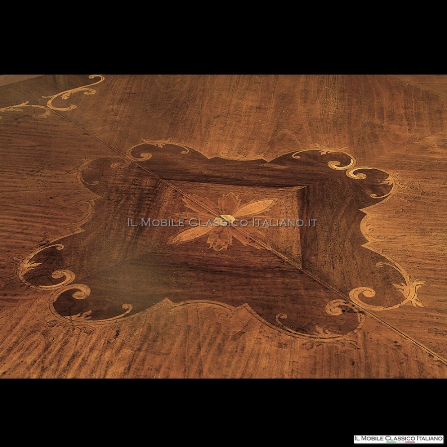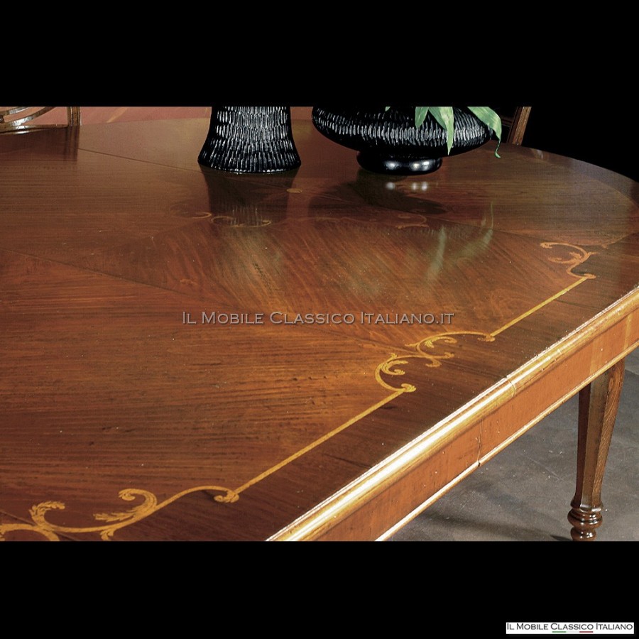 Notre table de salle à manger ronde extensible est dotée d'un plateau incrusté, conçu avec un savoir-faire expert. La marqueterie est une technique qui consiste à sertir différentes essences de bois précieux pour créer un motif décoratif sur le plateau de la table. La particularité de cette table est représentée par les rallonges de 60 cm qui reproduisent fidèlement le motif incrusté sur le plateau principal, afin de maintenir une continuité esthétique lorsque la table est allongée. Leur particularité de reproduire le dessin de l'incrustation sur le dessus garantit une parfaite harmonie visuelle, créant un effet esthétique de grand impact.