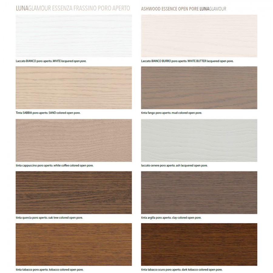 Les couleurs de la collection Luna Glamour peuvent être celles proposées par nos soins sur les photos ou d'autres types de laques à pores ouverts réalisées à votre demande. Le frêne brossé est également un matériau qui, en plus des laques, convient aux teintes bois.