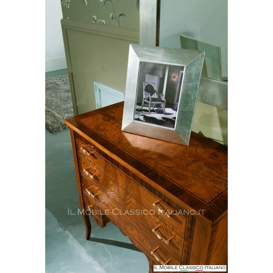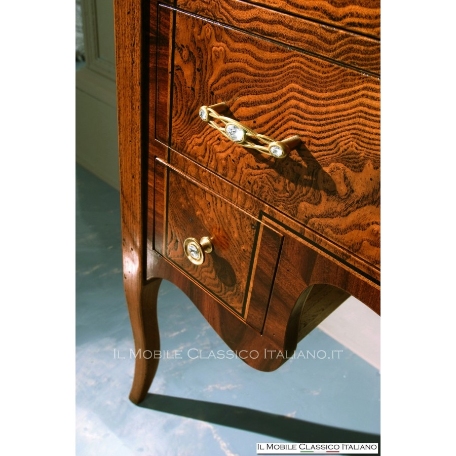 Voyons plus en détail cette commode marquetée , composée de 5 tiroirs et caractérisée par une incrustation de loupe de frêne sur les façades et sur le dessus, construite avec des essences de bois précieux.