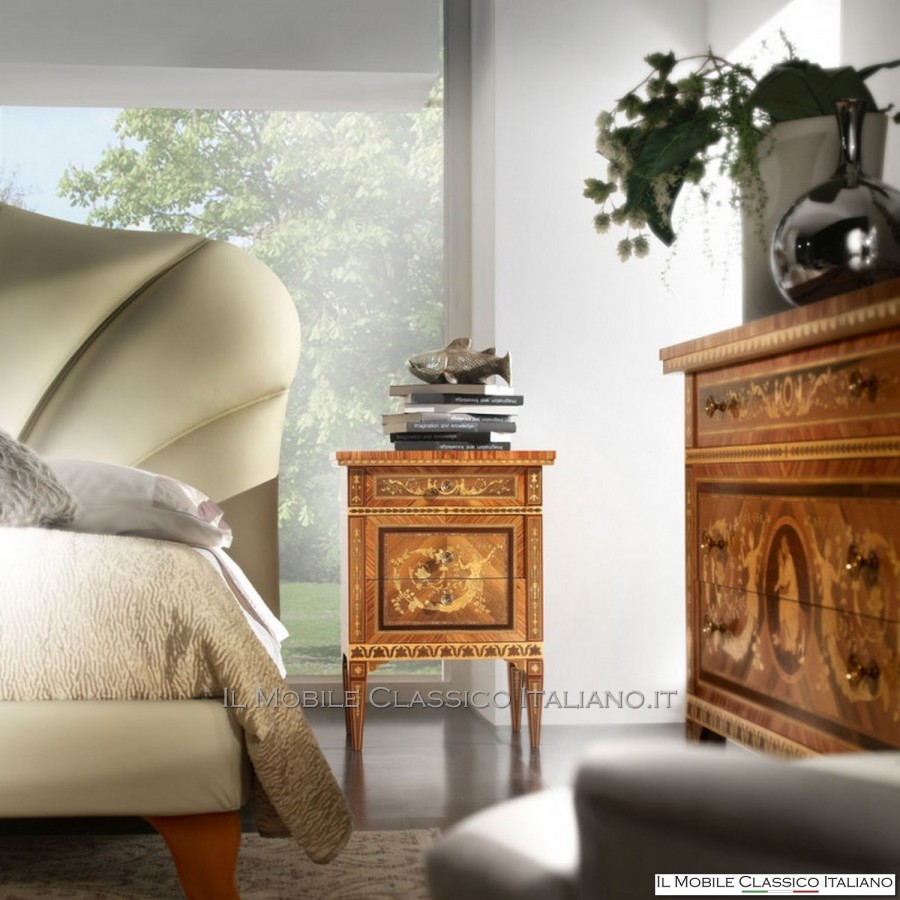 Cette paire de tables de chevet avec marqueterie de style classique vous permet de meubler la zone nuit de votre maison avec goût et élégance. Les environnements, même si dans un style contemporain / moderne, peuvent intégrer des objets de notre tradition italienne d'ébénisterie, créant une atmosphère accueillante et chaleureuse.