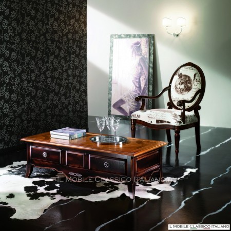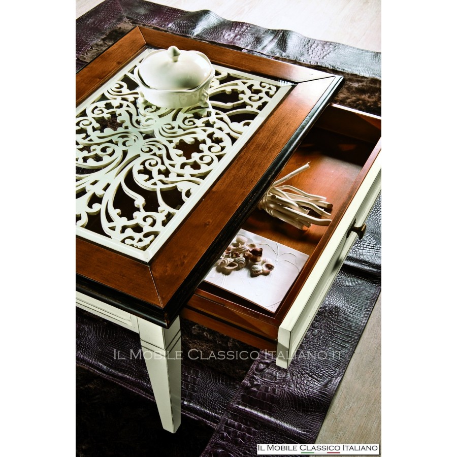 Questo tavolino con cassetto ha una forma classica, ma che con le giuste colorazioni possiamo far adattare anche a contesti più contemporanei. La presenza di un cassetto aiuta anche a contenere oggetti quali i vari telecomandi oppure qualche rivista.