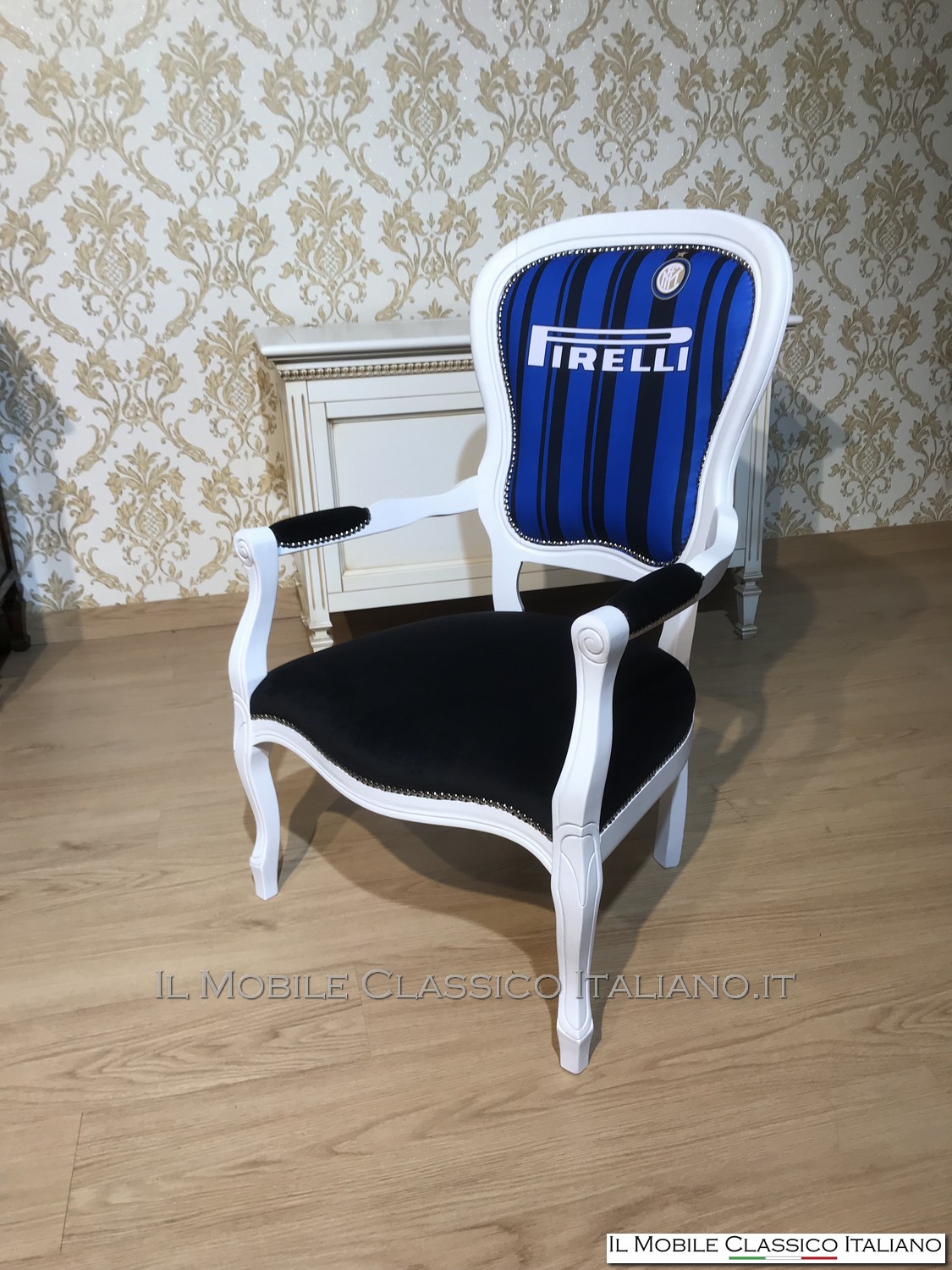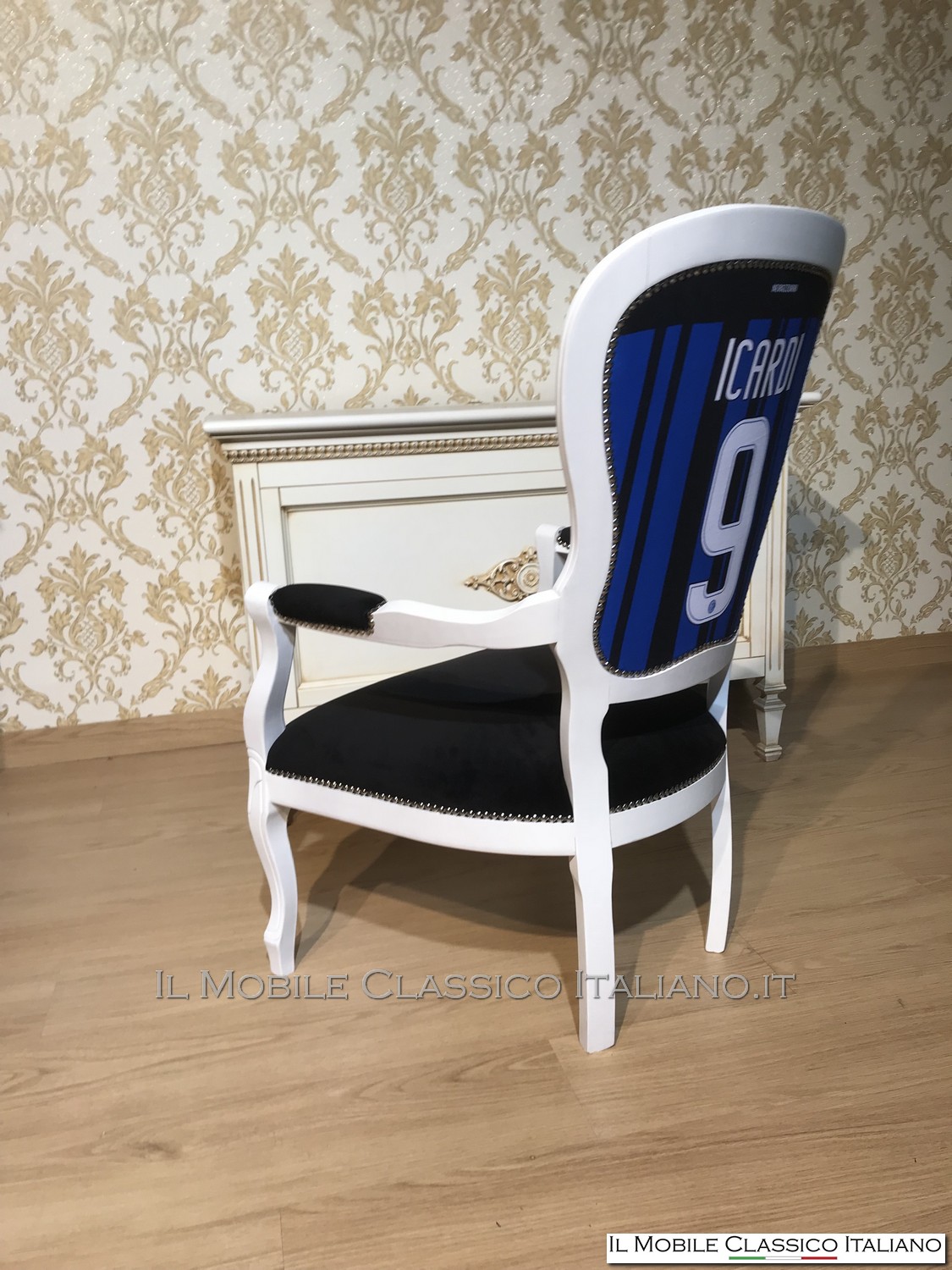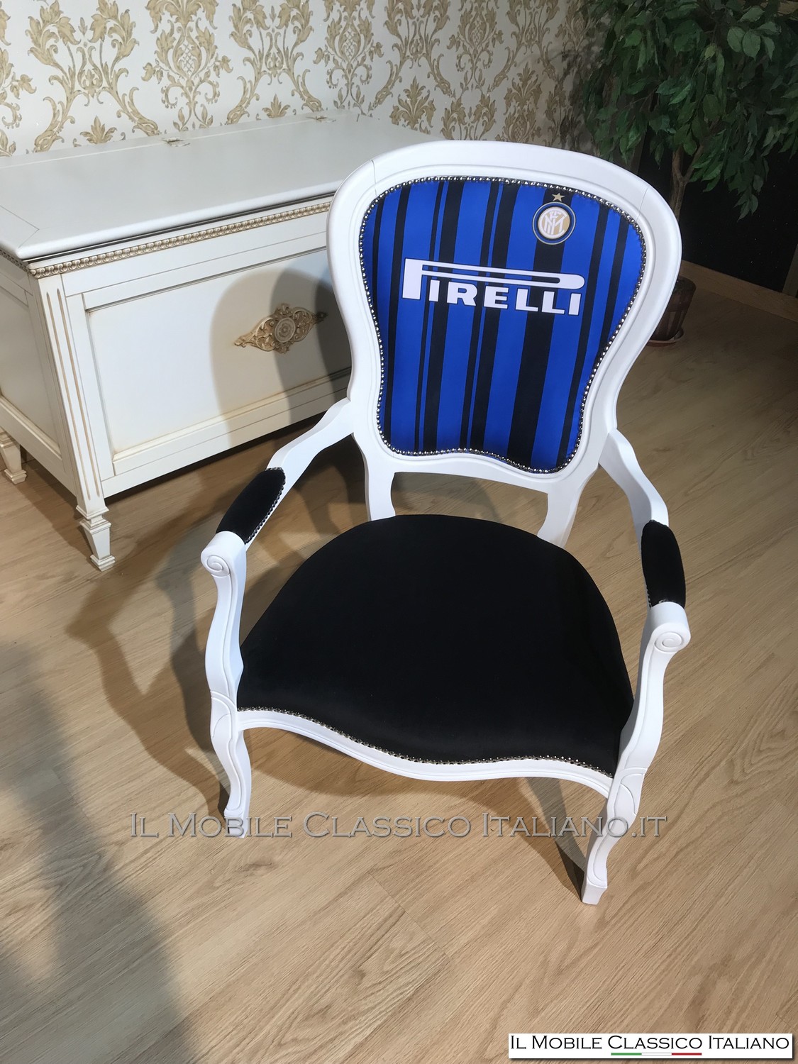 Una rivisitazione di una delle nostre poltrone, laccatura bianca e per la gioia di un tifoso dell'inter una maglietta della squadra come tappezzeria dello schienale... è possibile realizzarla con ogni maglietta e colore del fusto. Questo a conferma della nostra versatilità nel personalizzare i nostri complementi.