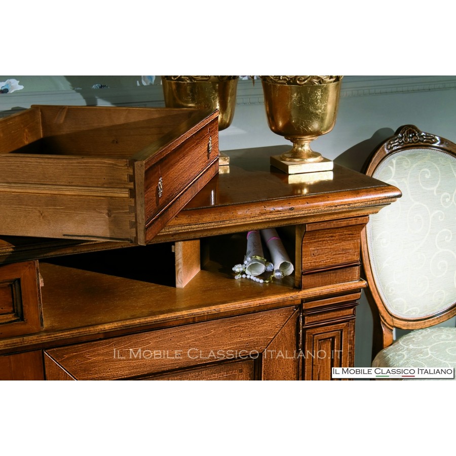 Vediamo più nel dettaglio questa Credenza in legno , composta da 2 ampie ante arricchite da un intarsio centrale, proseguiamo poi con 2 cassetti sotto il piano, particolarità di questa Credenza classica è il vano segreto da cui si accede estraendo il cassetto.