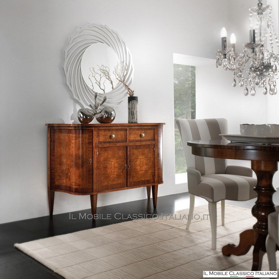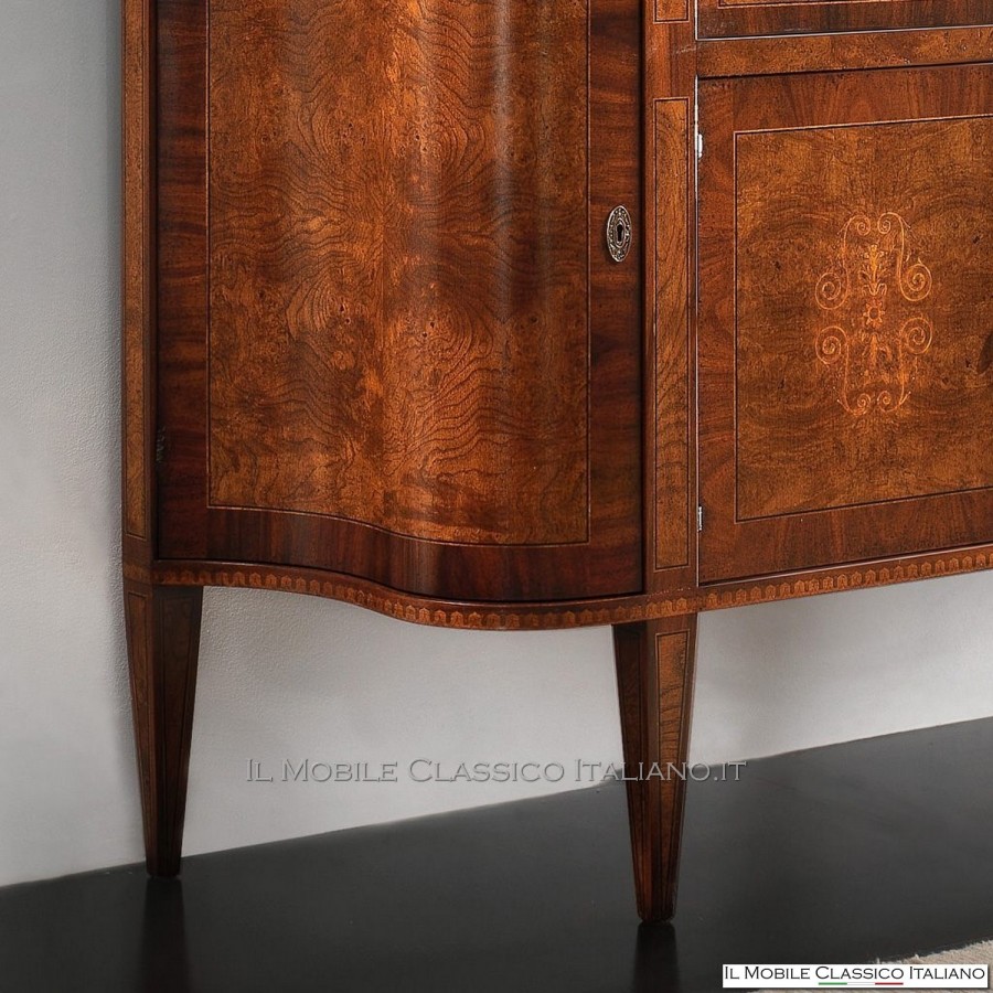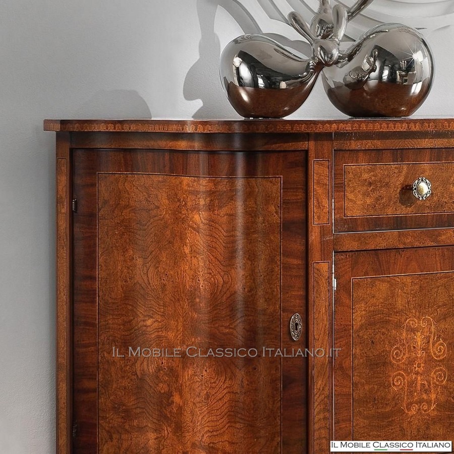 Questa credenzina sagomata, come tutti gli elementi della collezione Dolce casa, è una raccolta di vari mobili in stile per completare con armonia il vostro arredo e creare un'atmosfera calda e accogliente. La caratteristica principale di questi mobili classici è la complessità di realizzazione, infatti molti di questi mobili sono bombati, sagomati o intagliati. Presentano dei lati realizzati con pannelli curvati in una o due direzioni. Sulle superfici sono applicati intarsi, realizzati in essenze rare e pregiate come il noce nazionale, la piuma di noce, il bois de rose, il palissandro, l'acero, l'olivo, il bois de violette, lo zebrano o radiche di frassino, di rovere, di noce, di mirto, di noce persiana, di olivo. Le lavorazioni di questi mobili classici richiedono grande perizia ed esperienza.