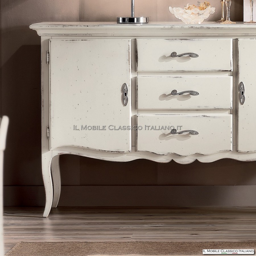 Il mobile è rifinito nei minimi dettagli, con una lavorazione artigianale che lo rende un pezzo d'arredo unico e prezioso. La finitura bianca opaca del legno massello è perfettamente integrata con le maniglie in metallo, creando un bellissimo contrasto che dona eleganza al mobile.