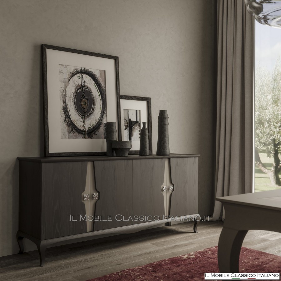 Le gambe sagomate aggiungono un tocco di grazia a questa credenza 4 porte in frassino. Queste gambe sagomate sono un dettaglio di design che conferisce un'atmosfera elegante e sofisticata all'arredo. Contribuiscono anche a sollevare la credenza dal pavimento, creando uno spazio sotto l'arredo che può essere sfruttato per la pulizia.