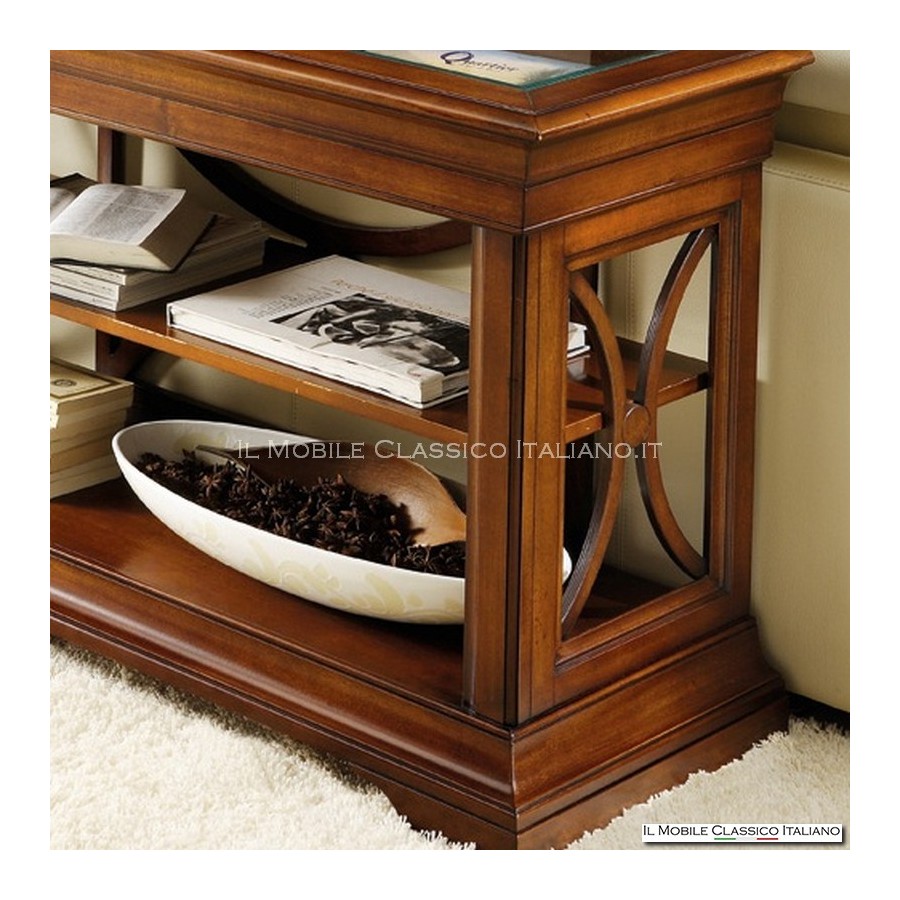 Mobile retrodivano classico, in versione liscia, composto da una mensola all'interno. Le pareti laterali sono aperte e delimitate da una crociera curva in legno, il piano d'appoggio ha unìapertura a bacheca con un cristallo molato.