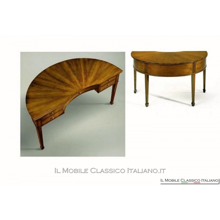 Questa scrivania mezzaluna, come tutti gli elementi della collezione Dolce casa, è una raccolta di vari mobili in stile per completare con armonia il vostro arredo e creare un'atmosfera calda e accogliente. La caratteristica principale di questi mobili classici è la complessità di realizzazione, infatti molti di questi mobili sono bombati, sagomati o intagliati. Presentano dei lati realizzati con pannelli curvati in una o due direzioni. Sulle superfici sono applicati intarsi, realizzati in essenze rare e pregiate come il noce nazionale, la piuma di noce, il bois de rose, il palissandro, l'acero, l'olivo, il bois de violette, lo zebrano o radiche di frassino, di rovere, di noce, di mirto, di noce persiana, di olivo. Le lavorazioni di questi mobili classici richiedono grande perizia ed esperienza.