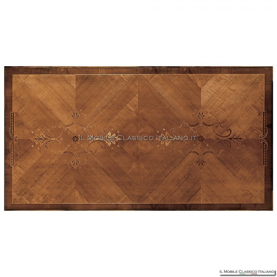 Il tavolo da pranzo presenta un piano con un intarsio che si estende per tutta la sua lunghezza. Questo piano, non essendo allungabile, non presenta linee di divisione, tipica dei piani con le allunghe, e ciò permette di ammirare l'integrità della lavorazione della bellezza dell'intarsio. Questa versione di piano intero è la scelta ideale per chi cerca un pezzo d'arredamento resistente e durevole. Non dovrai mai preoccuparti delle allunghe o della stabilità del tavolo, il che lo rende perfetto per l'uso quotidiano in famiglia. Il piano intarsiato è realizzato artigianalmente, il che significa che ogni tavolo è un pezzo unico e distintivo. Gli intarsi sono realizzati con cura e precisione, dando alla tavola un aspetto elegante e sofisticato che lo rende adatto ad ogni tipo di ambiente.