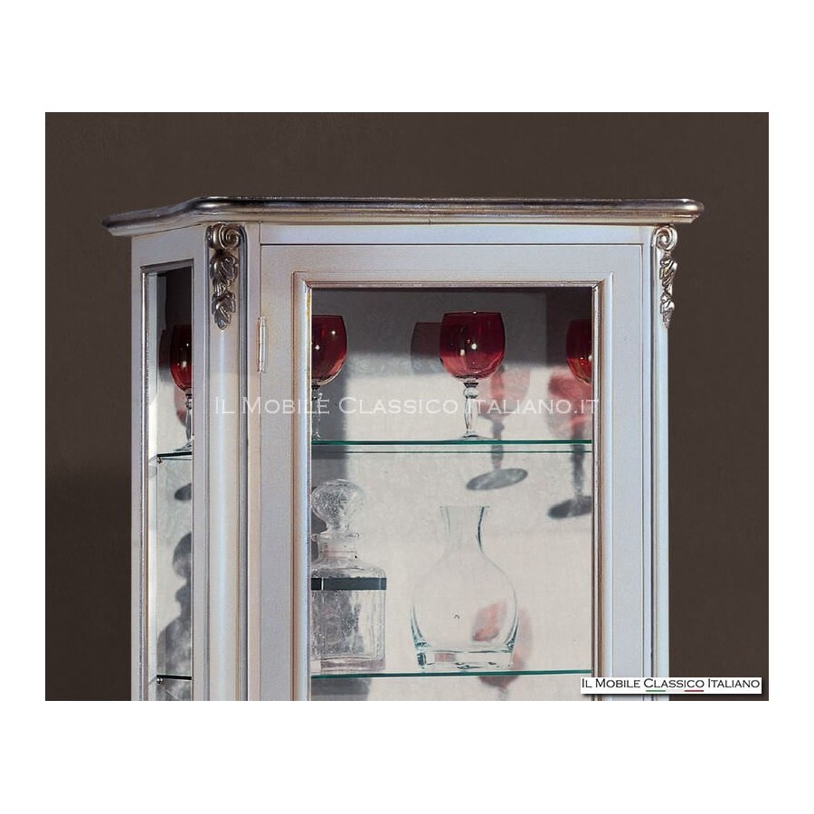 Questa Vetrina in stile provenzale è composta da 1 porta e 4 ripiani. I fianchi hanno un vetro come la parte anteriore. La struttura è interamente in legno massello e presenta intagli sulle gambe e sui profili, che nel colore come foto sono stati esaltati dalla foglia argento. Il Mobile vetrina stile 700 è in grado di unire perfettamente eleganza e funzionalità in un'unica soluzione, il complemento giusto per dare un aspetto lussuoso alla vostra casa.