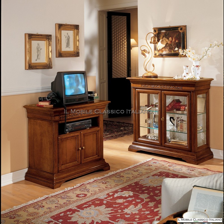 La vetrina soggiorno classica è composta da 2 porte con chiusura a chiave, impreziosita da vetri molati presenti su 3 lati del mobile. Questa vetrina soggiorno classica ha la caratteristica di avere il piano che si apre a bacheca, mentre il traverso posto sotto di esso riprende l'intaglio. All'interno la vetrina soggiorno classica presenta 2 ripiani in vetro ad altezza regolabile, e lo schienale è disponibile tappezzato, con specchio o verniciato dello stesso colore del mobile.