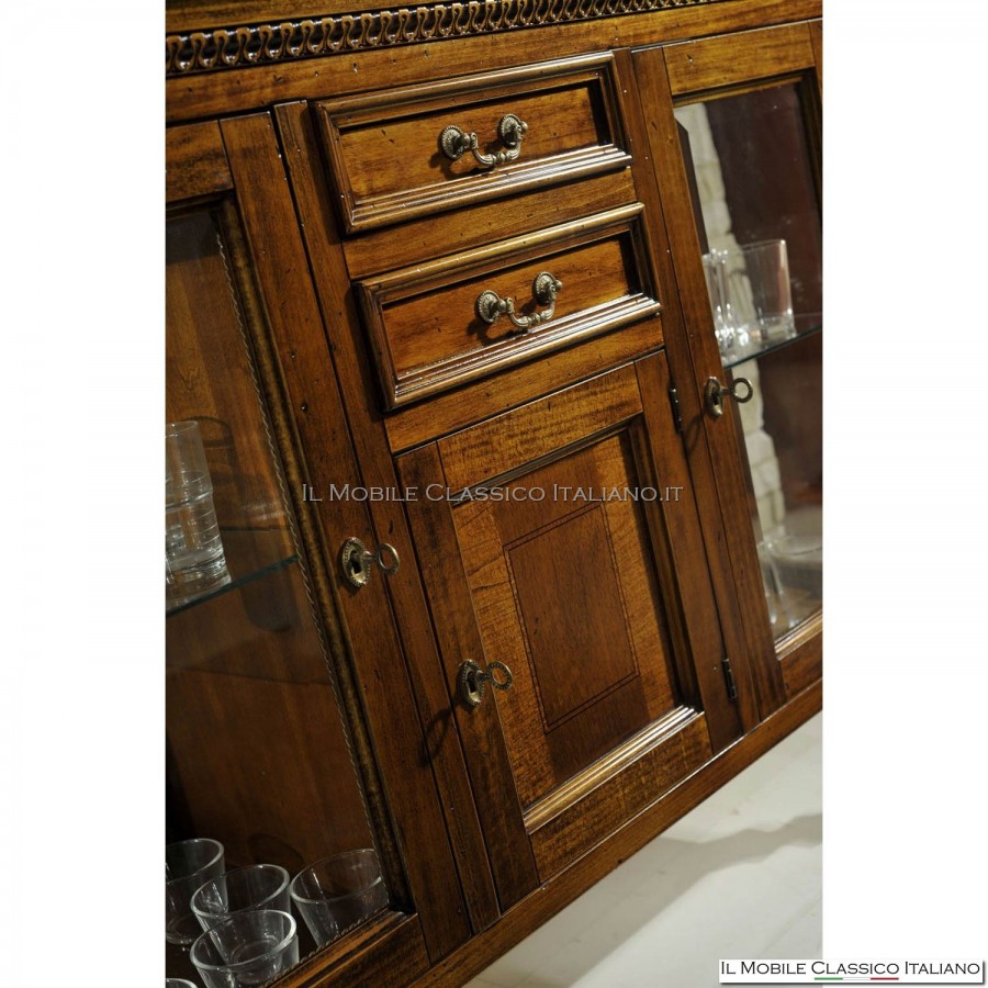 Questa vetrinetta è il complemento d'arredo ideale per valorizzare i propri oggetti decorativi, ma allo stesso tempo aggiungere un supplemento elegante e di grande pregio impiegando al meglio lo spazio a vostra disposizione. La vetrina è composta, nella parte centrale, da 2 cassetti dotati di maniglie e da una piccola porta con chiusura a chiave intarsiata in Ciliegio con filetto. I cassetti sono realizzati secondo un metodo antico e artigianale denominato incastro a "coda di rondine", con i fondi e le sponde sono in legno massello di abete. La vetrina ha inoltre 2 porte con chiusura a chiave, impreziosite da vetri molati presenti su 3 lati del mobile, e intagliate con scanalature che ne percorrono i lati. Il piano del mobile è massellato e impiallacciato in Ciliegio con filetto. All'interno presenta 2 ripiani in vetro ad altezza regolabile, e lo schienale è disponibile a specchio, tappezzato o verniciato del colore del mobile. Come tutti i complementi della collezione De Chirico, la vetrina è caratterizzata da un intaglio a tutto tondo sulla fascia al di sotto del piano d'appoggio, e dalle gambe dalla tipica forma a spillo, rendendola così un mobile unico nel suo genere per arredare la propria abitazione con uno stile raffinato e ricercato.
