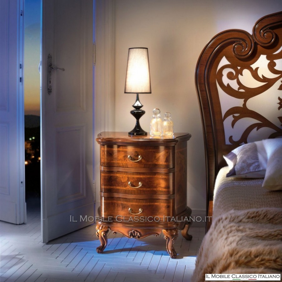 Questo comodino in radica di noce, come tutti gli elementi della collezione Dolce casa, è una raccolta di vari mobili in stile per completare con armonia il vostro arredo e creare un'atmosfera calda e accogliente. La caratteristica principale di questi mobili classici è la complessità di realizzazione, infatti molti di questi mobili sono bombati, sagomati o intagliati. Presentano dei lati realizzati con pannelli curvati in una o due direzioni. Sulle superfici sono applicati intarsi, realizzati in essenze rare e pregiate come il noce nazionale, la piuma di noce, il bois de rose, il palissandro, l'acero, l'olivo, il bois de violette, lo zebrano o radiche di frassino, di rovere, di noce, di mirto, di noce persiana, di olivo. Le lavorazioni di questi mobili classici richiedono grande perizia ed esperienza.
